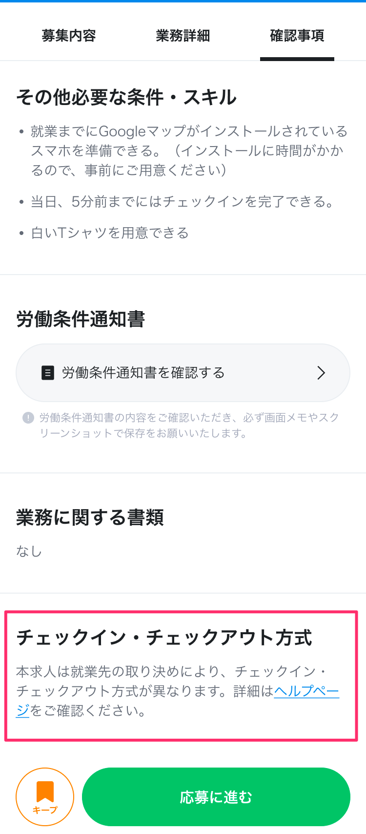 求人情報の[確認事項]タブ内に【チェックイン・チェックアウト方式】と記載がある場合、通常の求人情報と勤怠確定方法が異なりますのでご注意ください。